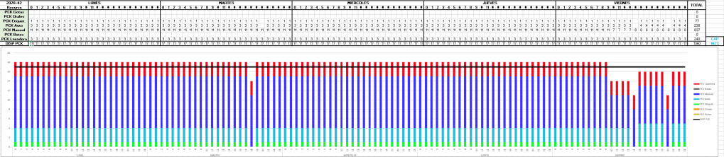 ¿Cómo saber si tienes demasiada carga ociosa? Un ejemplo práctico.: con 5 líneas de fabricación y 17 personas por turno de 8 horas, podíamos prever gráficamente cuándo la plantilla iba a estar saturada, ociosa, o trabajando de forma equilibrada. El objetivo era claro: mantener una curva de carga de trabajo lo más plana posible, maximizando la eficiencia sin agotar al equipo.