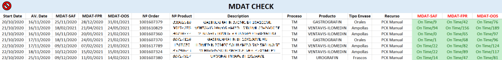 - Módulo MDAT Check: en base al plan de producción propuesto y las fechas de producción, suministro y rotura de stock de cada orden de producción, se compara la fecha de liberación del lote respecto a las anteriores, prediciendo los potenciales riesgos de suministro.