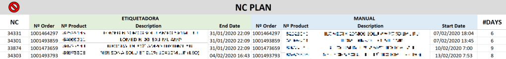 - Módulo NC Plan: a partir del concepto “número de campaña”, se analiza el tiempo entre líneas de producción consecutivas para identificar puntos críticos en el Plan o envío a Almacén Automatizado para posterior procesado.