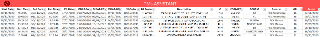 - Módulo Asistente TMs: en base a los tiempos de liberación del producto y la fecha de entrega deseada, se ordena de mayor a menor nivel de prioridad los productos a fabricar y enviar a destino, optimizando las campañas de formatos y maximizando la operatividad de las líneas de producción.
